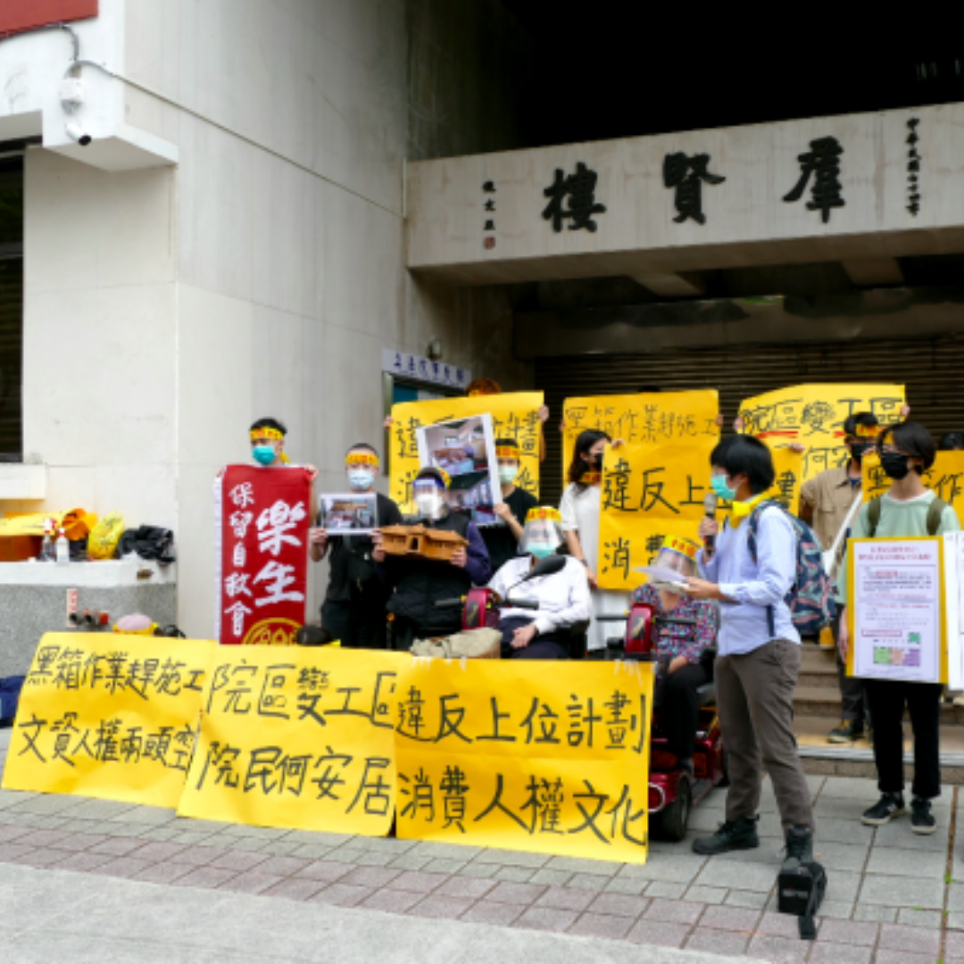 院區變工區 院民何安居 黑箱作業趕施工 文資人權兩頭空 違反上位計劃 消費人權文化 【地點】立法院群賢樓外(台北市中正區濟南路一段1號) 【出席單位】國際愛地芽協會台灣分會、台灣人權促進會、台灣蠻野心足生態協會、立法委員王婉諭、立法委員林奕華、立法委員賴香伶