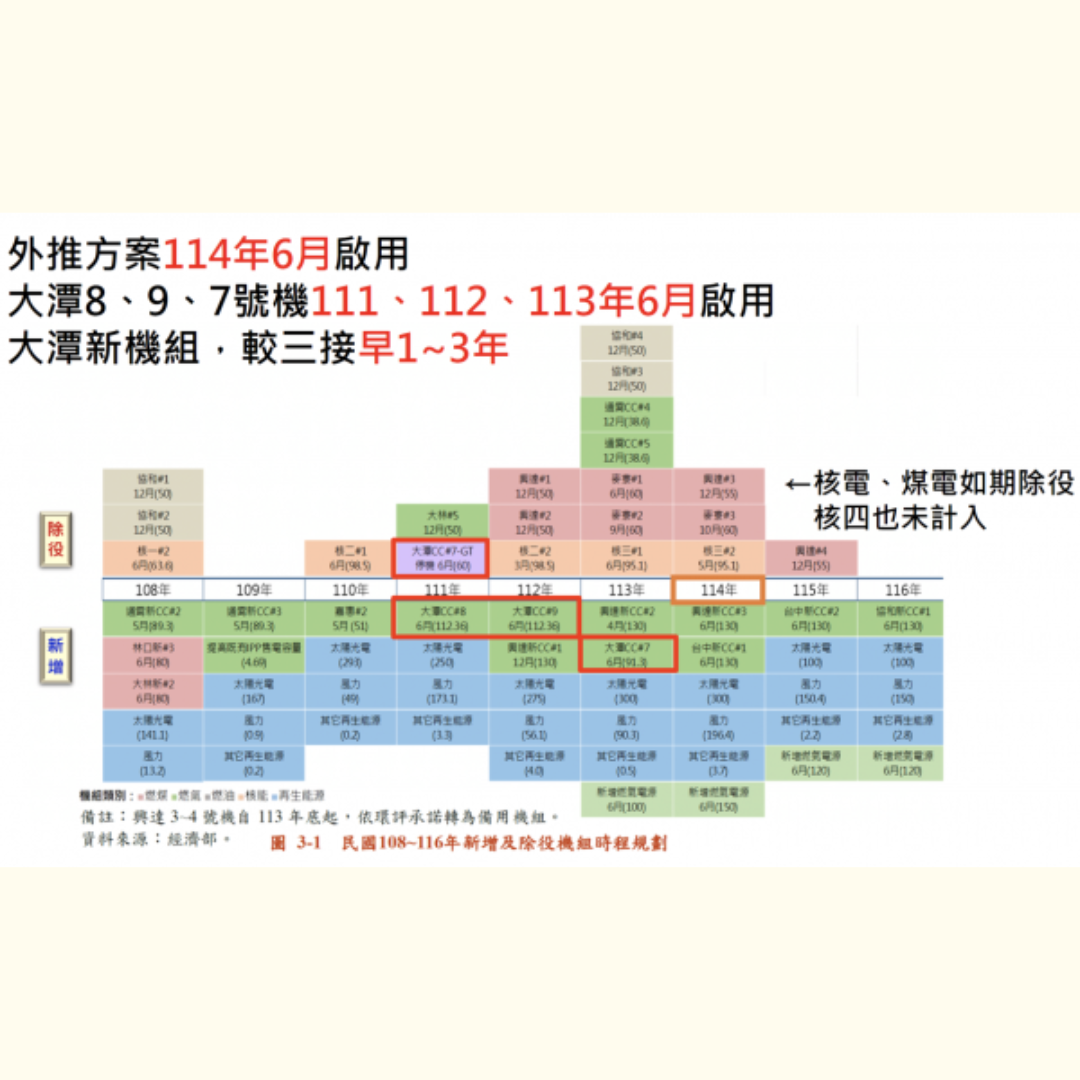 日前經濟部次長曾文生表示:若三接外推方案未通過,砍掉重練將耗時超過11年,影響大潭電廠8、9號機供電,一年少137億度電,須改以500萬噸煤發電。 然比對今年5月能源局公布的《108_109年度全國電力資源供需報告》,大潭電廠8號機預計111年6月上線,同時7號機停機改為複循環機組,9號機於112年6月上線,該二機組上線時程,較114年6月三接外推方案啟用,早了