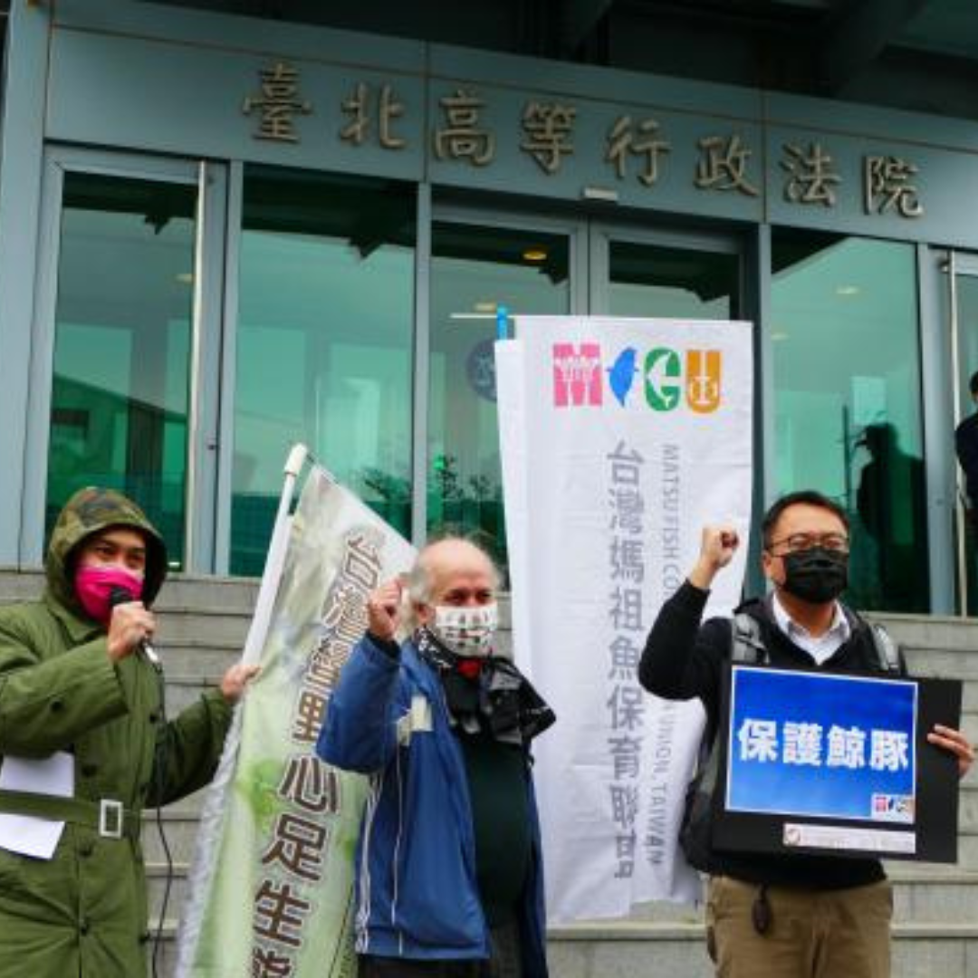 從年頭到年底為台灣白海豚生存奔波不懈 2021年最後一天上班日12月30日下午,台灣蠻野心足生態協會創辦人文魯彬先生、現任理事長陳憲政律師、受任律師郭鴻儀、李菁琪,以及本會白海豚議題專員施仲平等,頂著冷冽的天氣,在『海洋竹南離岸式風力發電計畫』公民告知訴訟辯論庭開庭前,於台北高等行政法院前舉行記者