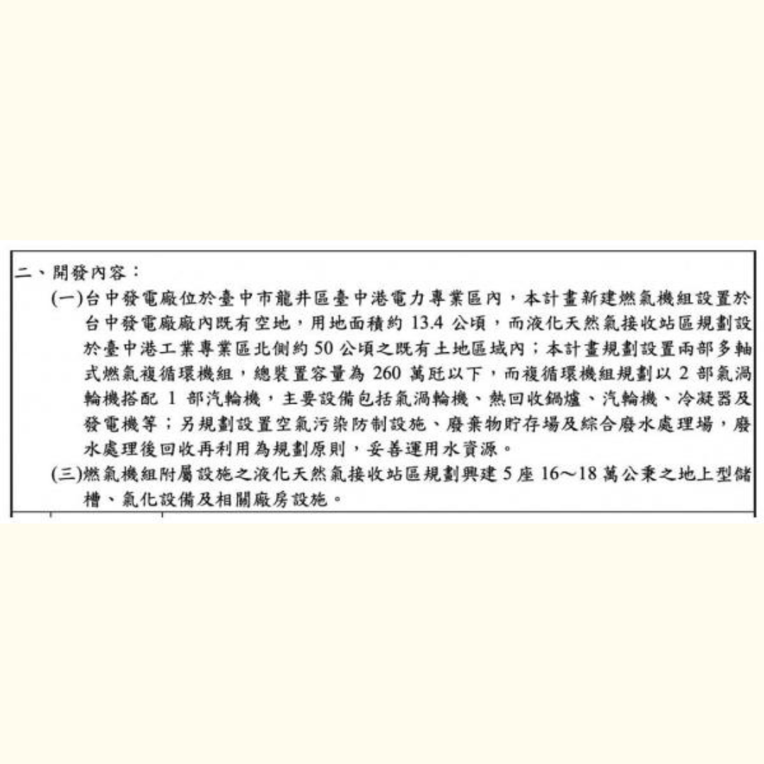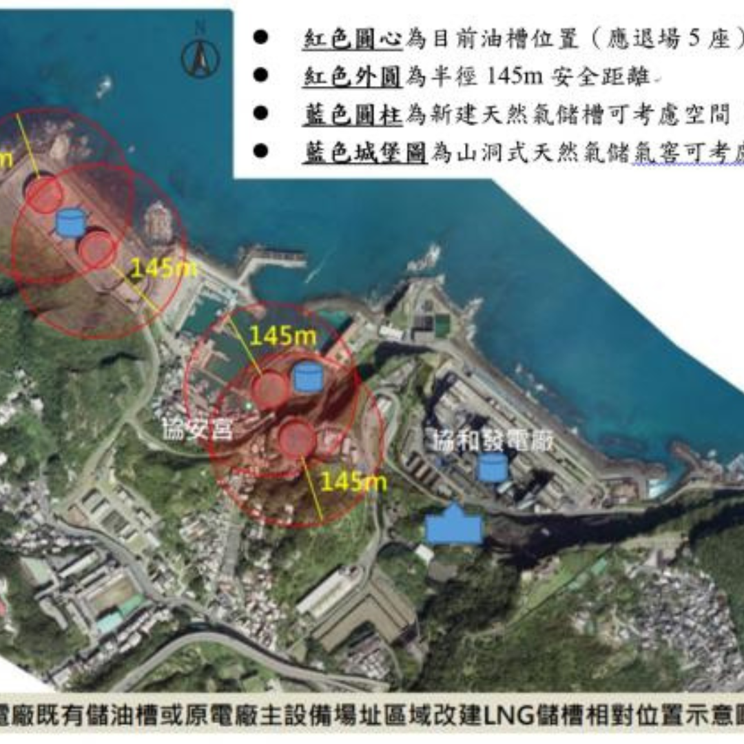 一、優先檢討廠內空間配置,避免填海造地: 協和電廠更新改建後,4部燃油發電機組減為2部燃氣發電機組,5座儲油槽也不再需要,理當可空出部分空間,應優先檢討廠內空間配置(如:儲氣槽設在2部發電機組中間;或將2座儲氣槽分散設置在原2座儲油槽及3座儲油槽中間;或於山洞設置儲氣窖等),避免活埋74,392株珊瑚的填海造地工程。 二、2050年淨零碳排政策