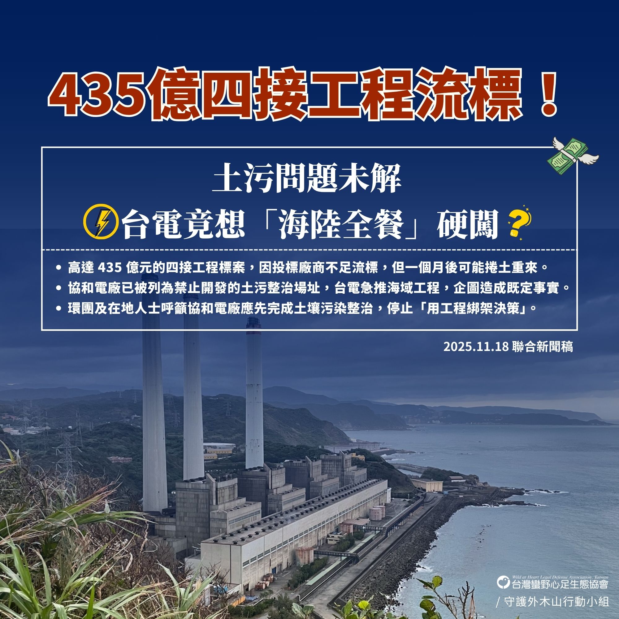 【2025/11/18聯合新聞稿】435億四接工程流標!💸 土污未解 台電竟想「海陸全餐」硬闖?