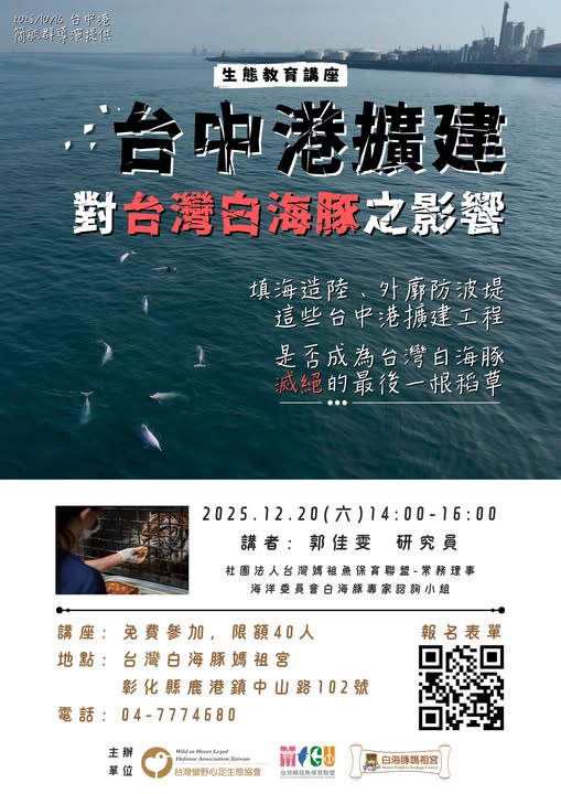 而填海造陸、外廓防波堤,這些台中港擴建的工程,其目的是什麼?又會對台灣特有亞種,且僅存不到50隻的台灣白海豚,產生什麼影響?是否有減輕或替代方案?🎤透過本次演講,帶你了解。